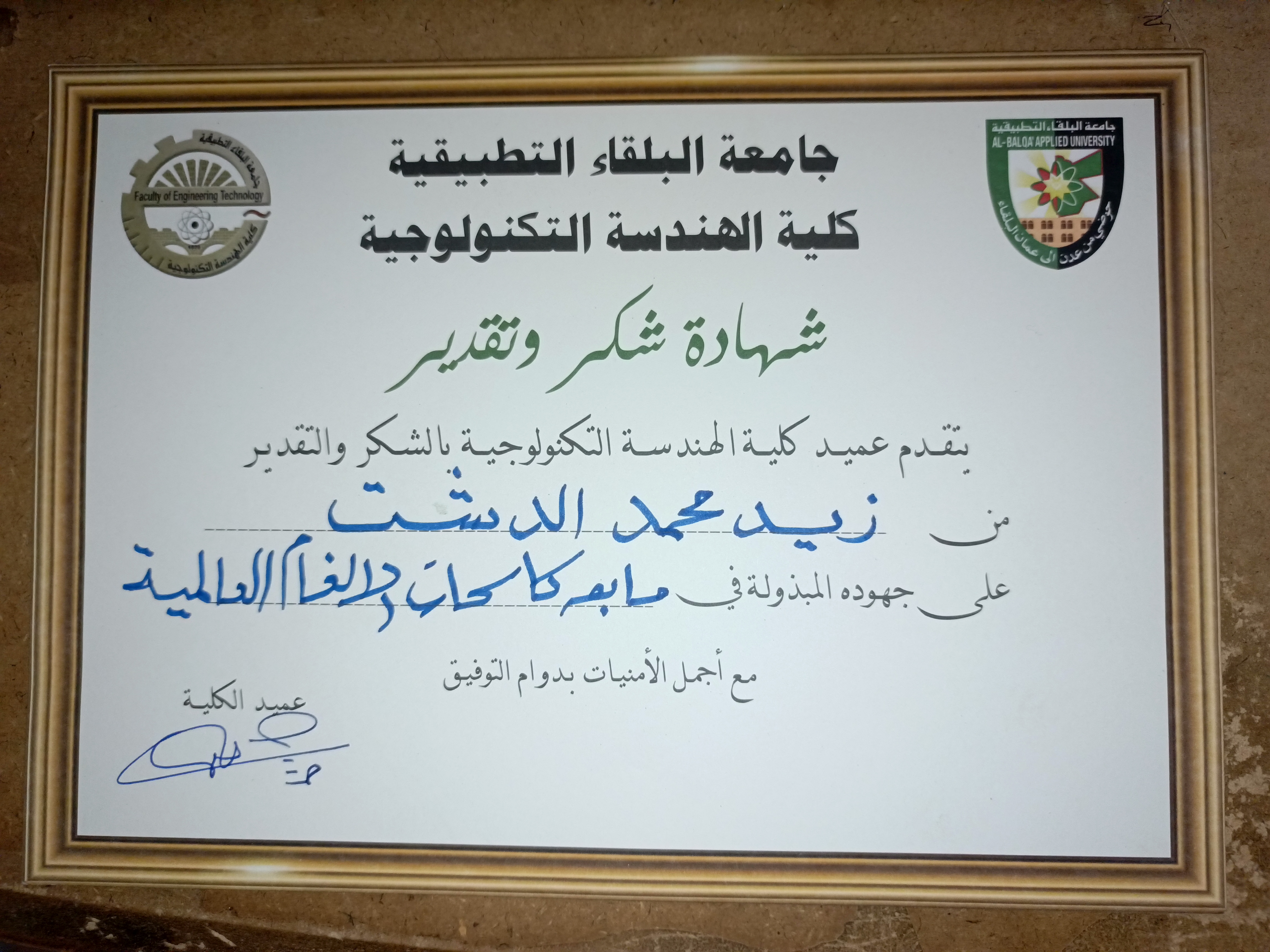 Received an Appreciation Award at the Minesweepers Competition in Egypt, representing Jordan as part of the Mamba Team. Recognized for developing an innovative mine detection robot.To see our video click here.