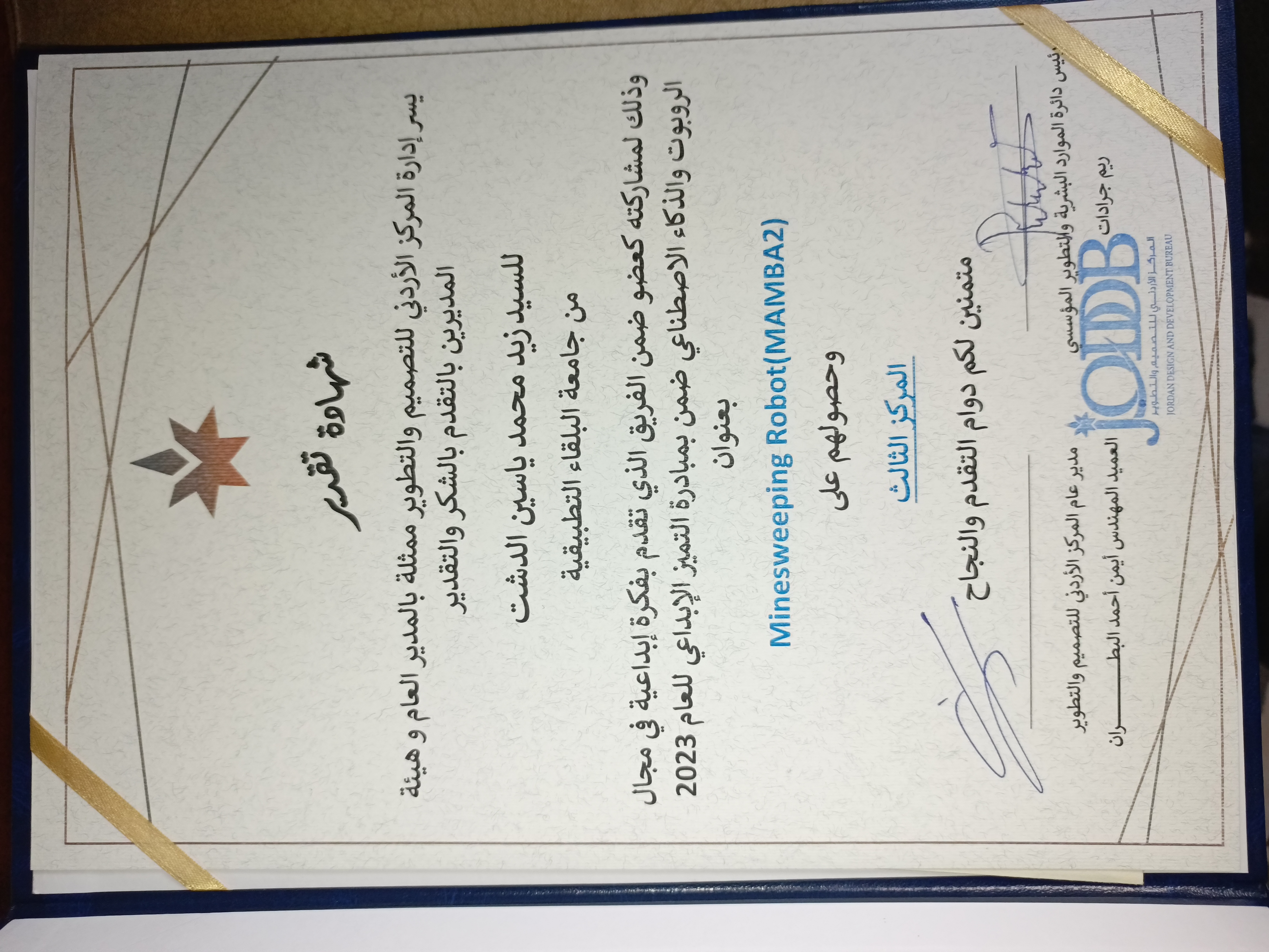 Mamba Team Achieves Third Place in Jordan Design and Development Bureau's Creative Excellence Initiative! Following this achievement, we collaborated with JODDB to develop a fully functional mine detection robot prototype. Our work included integrating advanced features utilizing robotics and artificial intelligence, enhancing its capabilities for defensive military missions, and contributing to human life preservation.