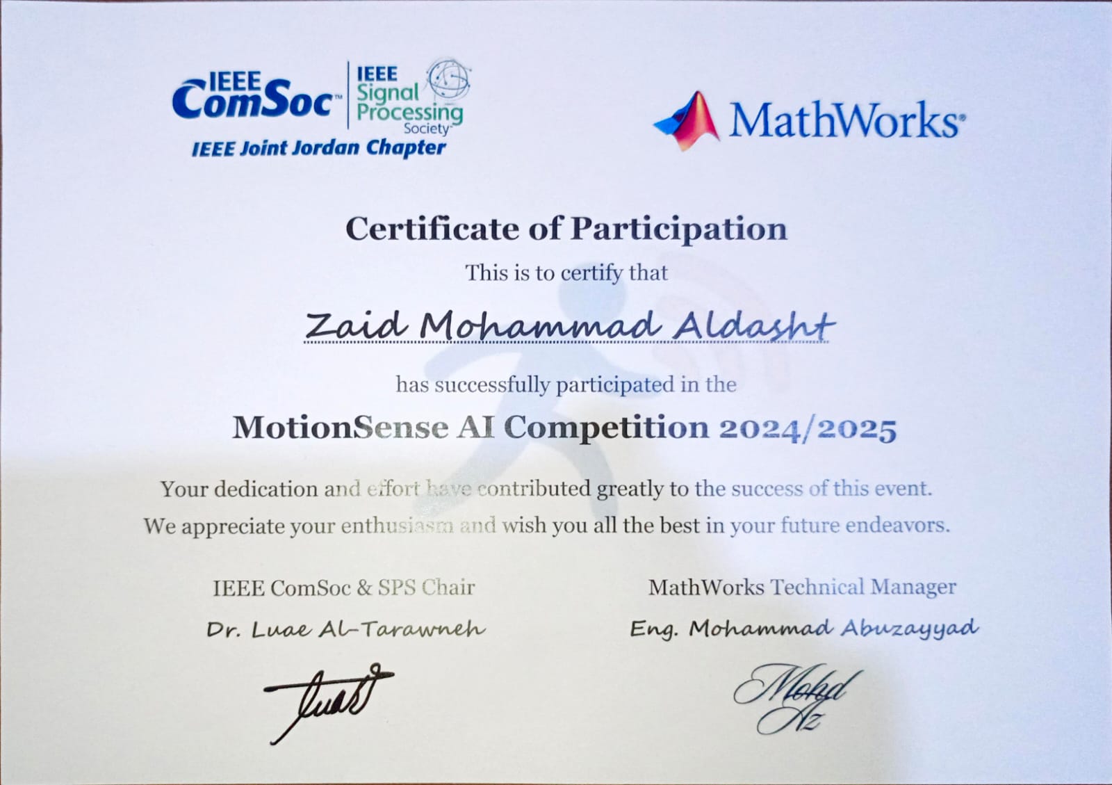 Participated in the MotionSense AI Competition by MathWorks, where we developed a Flutter application to stream sensor data (accelerometer, gyroscope, magnetometer) in real-time to a server. An AI model then analyzed the data to classify different movement patterns such as walking, running, and standing.