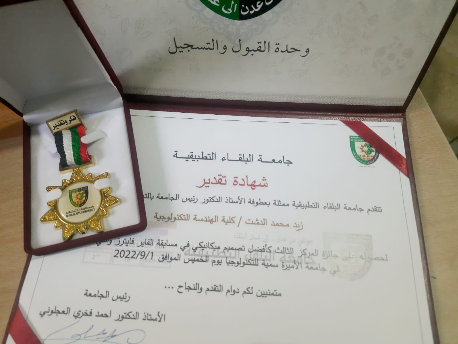 Received an Appreciation Award for participating three consecutive times in the Sumo Robot Competition at HTU. This ongoing journey strengthened our creativity, teamwork, and engineering problem-solving skills.